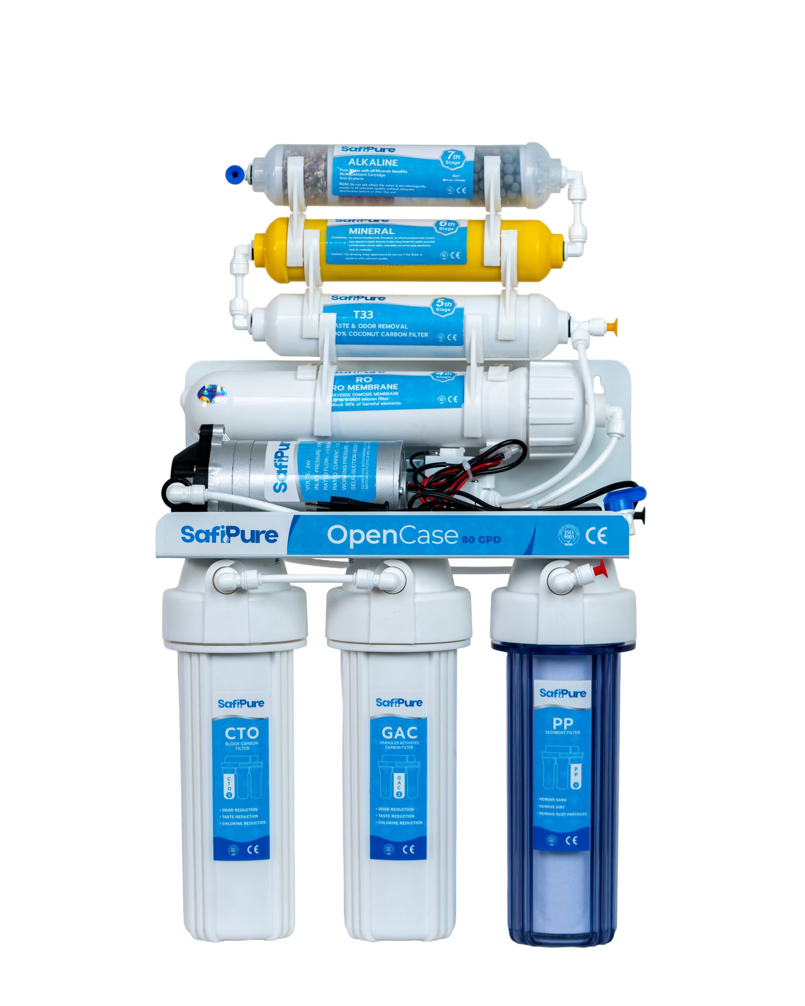 Le SafiPure OpenCase 80 GPD offre une solution complète de filtration avec osmose inverse en 7 étapes, une pompe puissante en aluminium, et un châssis ouvert pratique pour une maintenance simple.